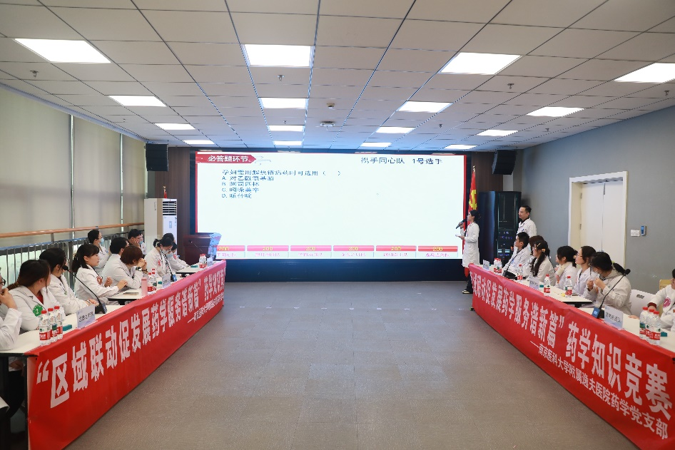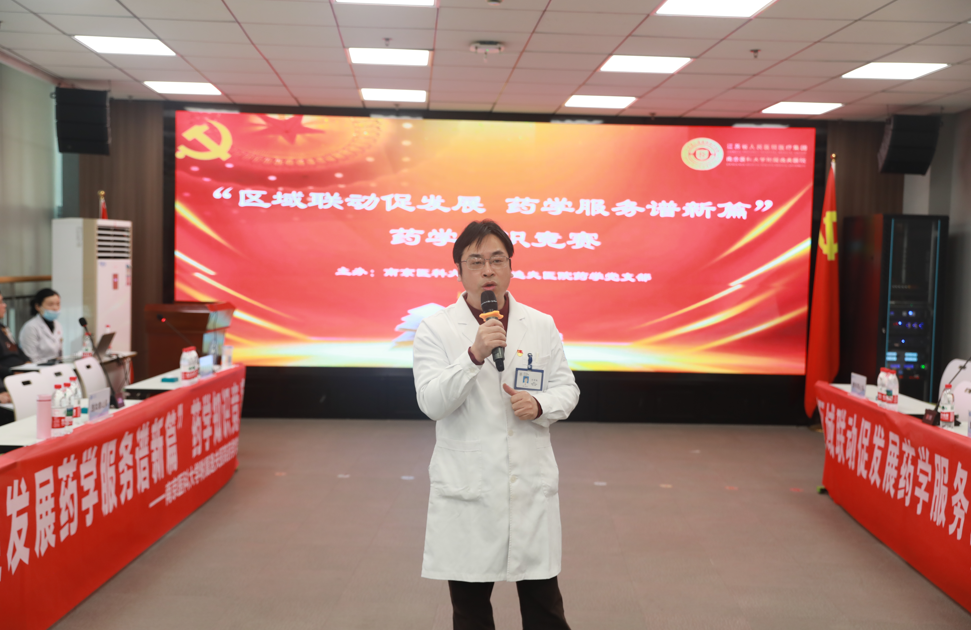 为促进南京医科大学附属逸夫医院与社区卫生服务中心药学服务协同发展,提升区域药学队伍整体专业能力,加强医疗机构之间药学服务合作,1月27日下午,南京医科大学附属逸夫医院药学党支部联合各家社区卫生服务中心成功举办以“区域联动促发展,药学服务谱新篇”为主题的药学知识竞赛。来自7家医联体社区卫生服务中心以及我院药学党支部药师共同组成的6支参赛队伍、18名参赛选手通过“以赛促学,以赛促建”的方式,为区域药学人员搭建了技能展示与交流提升的优质平台。南京医科大学附属逸夫医院许贤林副院长、江苏省人民医院药学部万彬主任、南京医科大学附属逸夫医院医务处张皓主任、医技党总支书记李妍主任、药学部唐玉林主任、药学部何宏亮主任出席活动,共同见证这场药学专业的比拼。