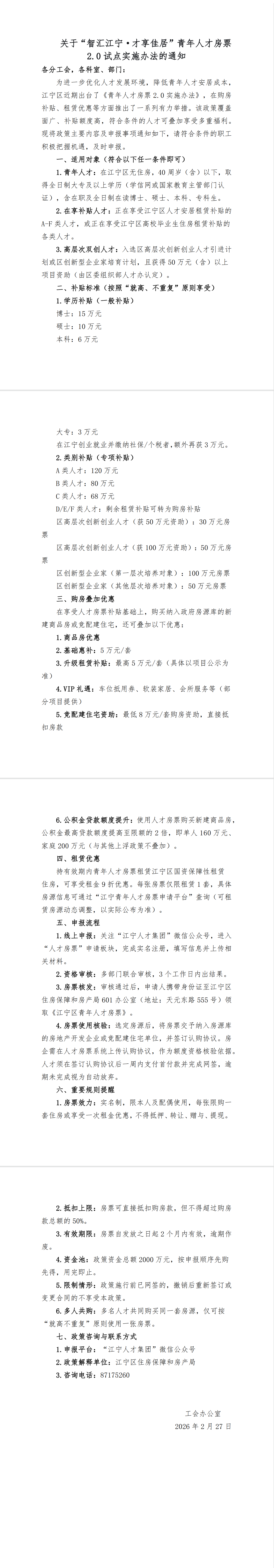 关于“智汇江宁·才享佳居”青年人才房票2.0 试点实施办法的通知
