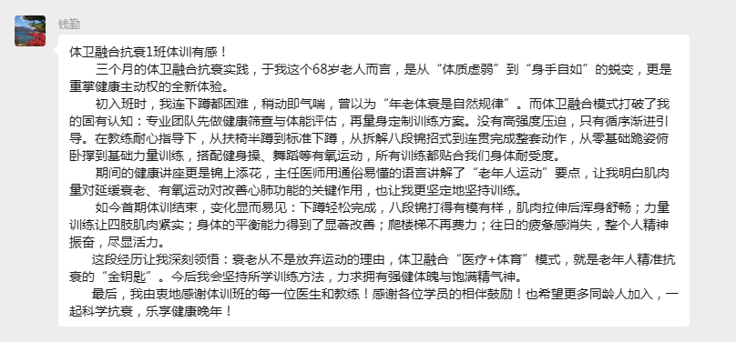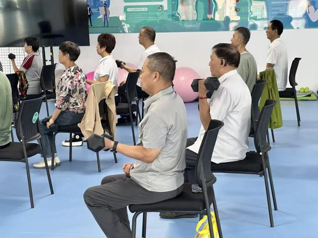 由江苏省人民医院、省体科所和我院共同承办的“江苏省抗衰弱体卫融合工程研究中心”在方山社区卫生服务中心成立分中心后的落地项目,首期体训班招募20名社区老年学员,历经三个月系统培训,构建了“医疗评估+科学训练+健康干预”的闭环服务模式——定期开展健康监测与风险评估、个性化健身指导,让专业医疗护航运动安全,让科学运动延缓衰弱进程。