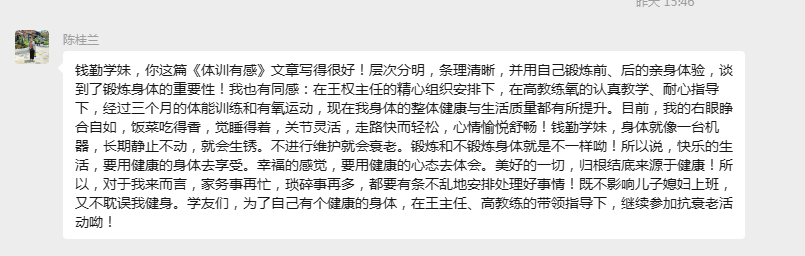 体训班的成功举办是逸夫医院医共体建设与医疗资源下沉的重要成果,让社区居民在家门口享受到了“三甲医院标准+专业体育指导”的优质健康服务。未来,我院将持续发挥医疗、科研优势,与各家社区卫生服务中心共同推进“江苏省抗衰弱体卫融合工程研究中心”建设,将“科学健身+慢病防治”模式常态化、规模化,为基层健康事业发展注入更多动能,让体卫融合的红利惠及更多社区居民。