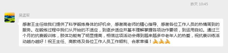 仪式现场为全体结业学员颁发了结业证书。年过六旬的学员钱阿姨激动地分享:“经过3个月的体卫融合抗衰实践,于我这个68岁老人而言,是从“体质虚弱”到“身手自如”的蜕变,更是重掌健康主动权的全新体验。”同样参加训练的陈阿姨表示:”身体就像一台机器,长期静止不动,就会生锈。不进行维护就会衰老。锻炼和不锻炼身体就是不一样呦!所以说,快乐的生活,要用健康的身体去享受。幸福的感觉,要用健康的心态去体会。美好的一切,归根结底来源于健康!”