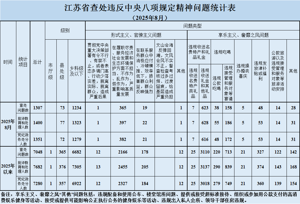 2025年8月,全省共查处违反中央八项规定精神问题1307起,批评教育和处理1400人、其中给予党纪政务处分1351人。从问题类型看,查处形式主义、官僚主义问题386起、批评教育和处理421人,查处享乐主义、奢靡之风问题921起、批评教育和处理979人。从人员级别看,批评教育和处理县处级干部77人、乡科级及以下人员1323人。