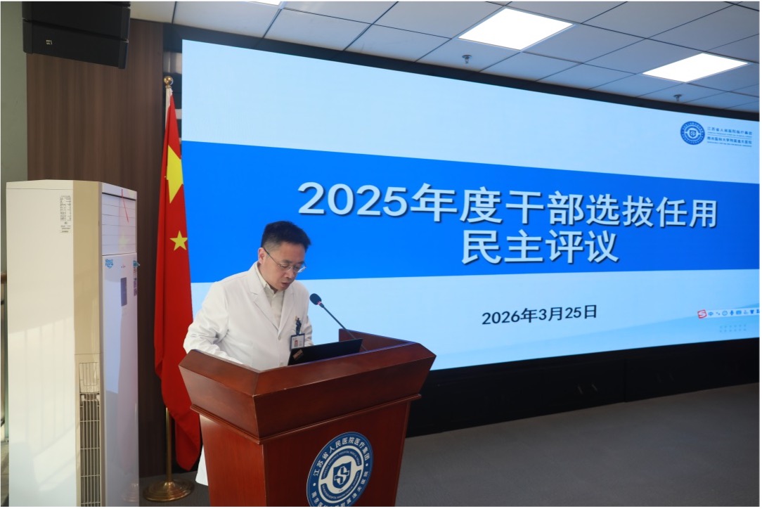 为深入贯彻落实新时代党的组织路线,全面规范干部选拔任用工作,切实强化干部监督管理,3月25日下午,我院在E105会议室召开2025年度干部选拔任用工作民主评议会。南京医科大学党委副书记徐珊同志出席会议并讲话,会议由我院院长管晓翔同志主持。南京医科大学党委组织部相关同志、医院领导班子成员、各科室负责人、职能部门中层干部、护士长、党总支及党支部书记、党支部委员、一线员工代表等参会。